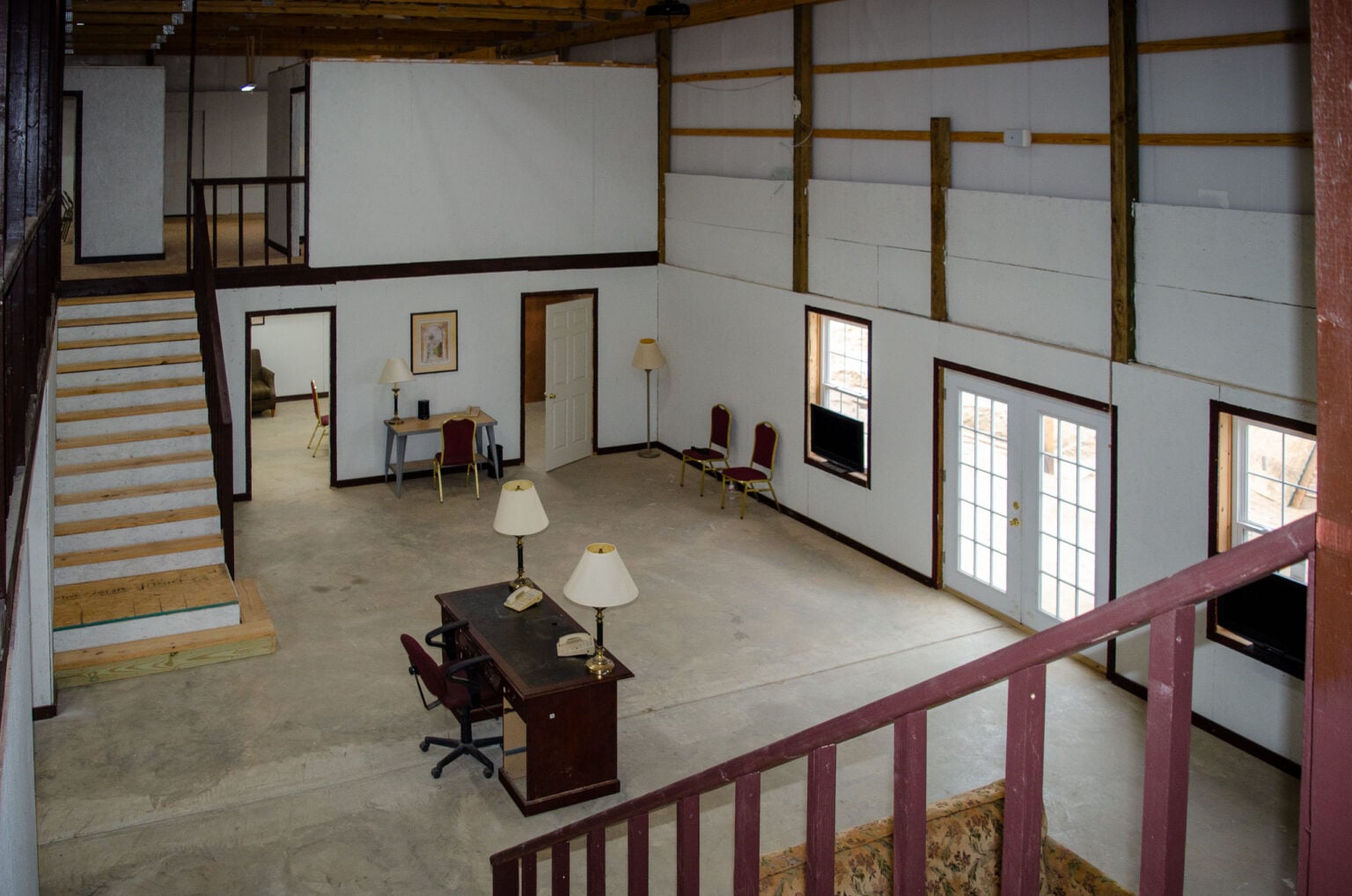 The SIMS CQB Training Facility (the “Embassy”) sits in the northwest corner. Two stories designed to be difficult to clear – six unique stairwells, doors opening in opposing directions, hidden areas, and a master control room with light/audio override for scenario escalation. 48 closed-circuit cameras record every room for review.