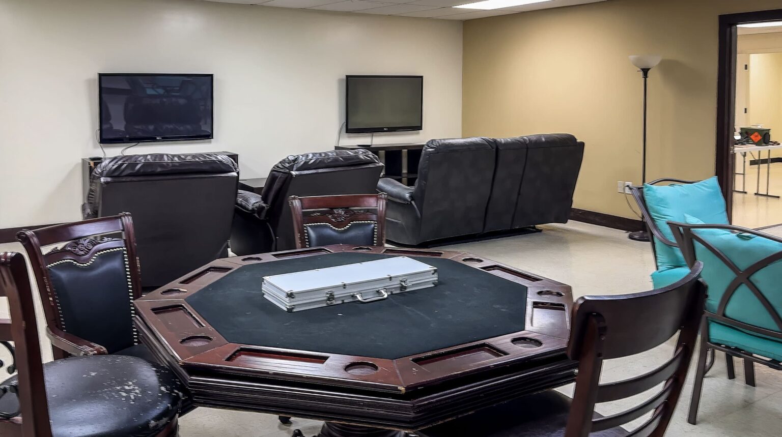 The recreation side includes a movie room with satellite TV, two gaming stations with preloaded retro systems, and a foosball table. The building operates during power outages. After a 14-hour day running NVG evolutions in the MOUT, this is where your team decompresses without leaving the property.