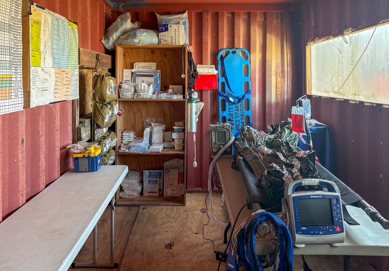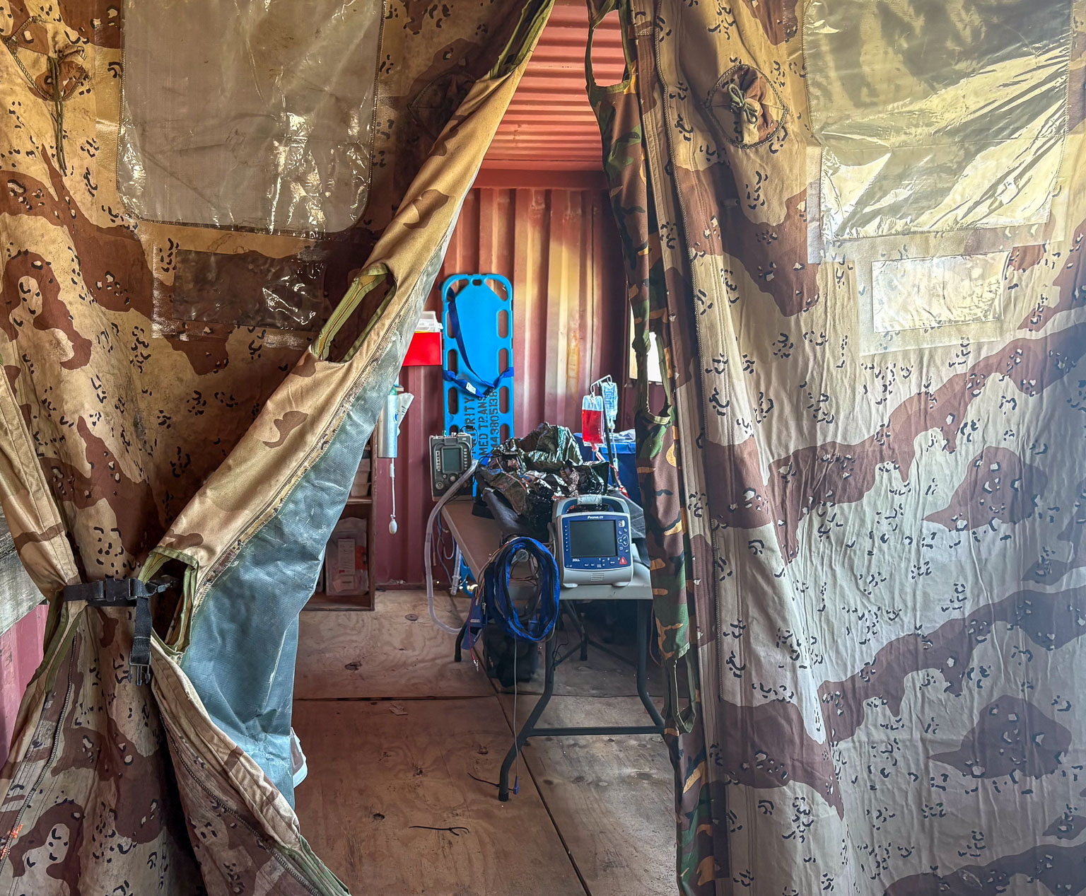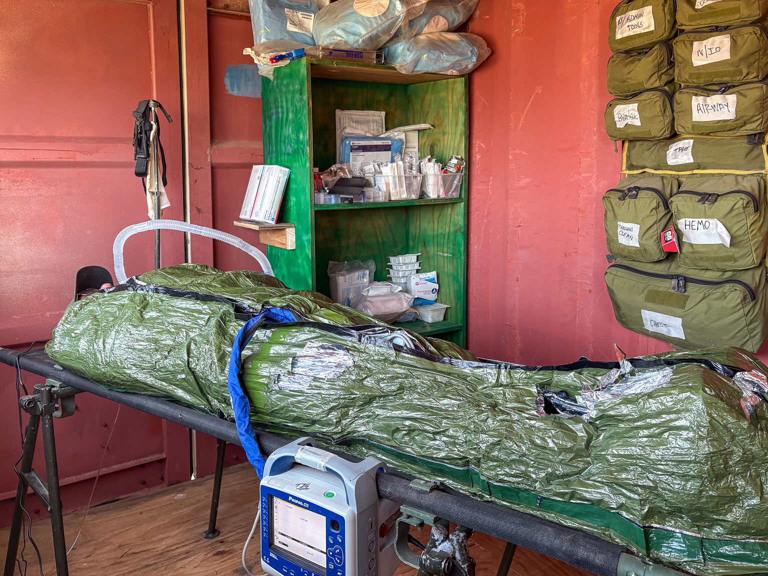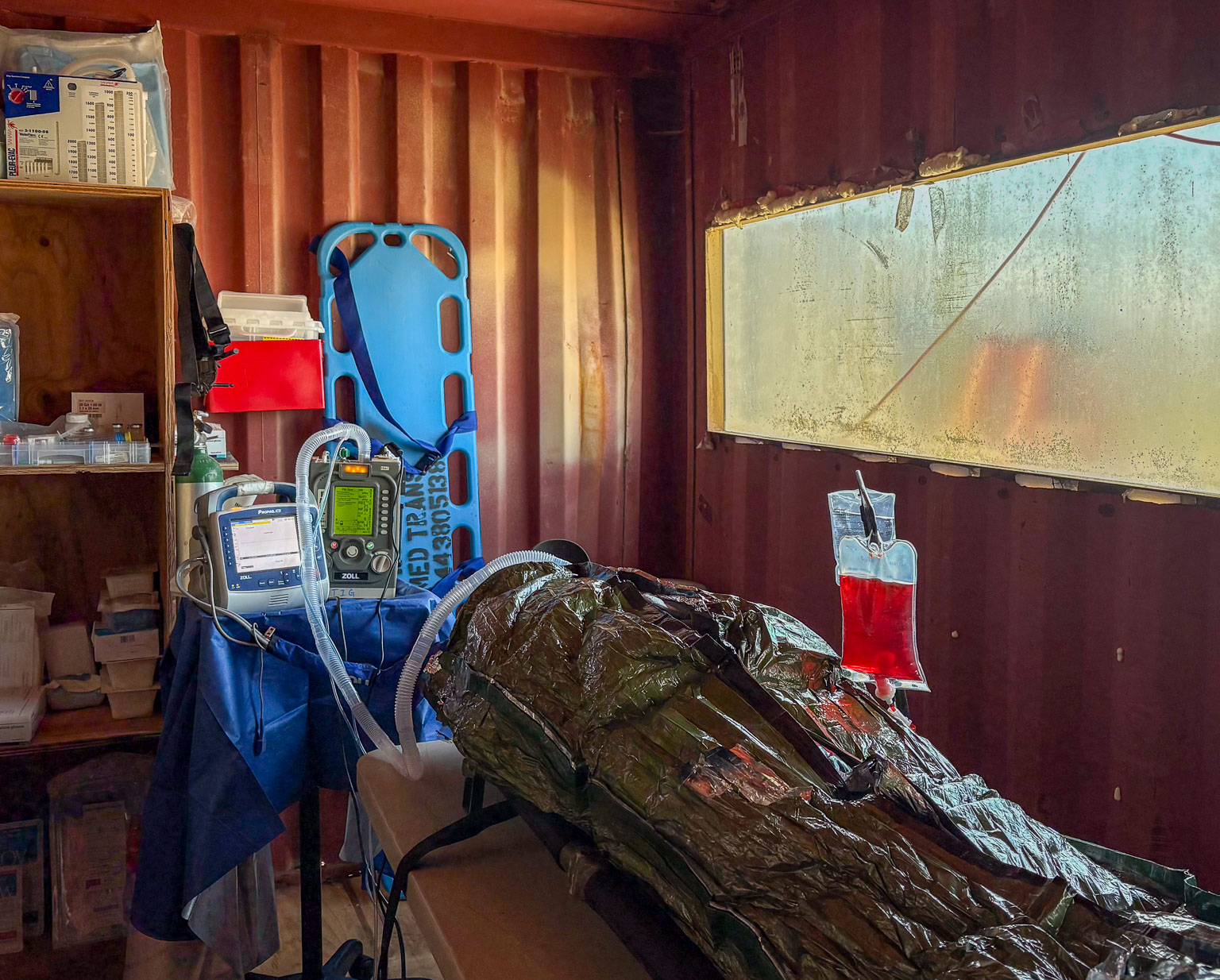 Gold band: Purpose-built compound for prolonged field care — degraded infrastructure, switchable power, and the clinical problem-solving that keeps casualties alive when evacuation is hours away.
