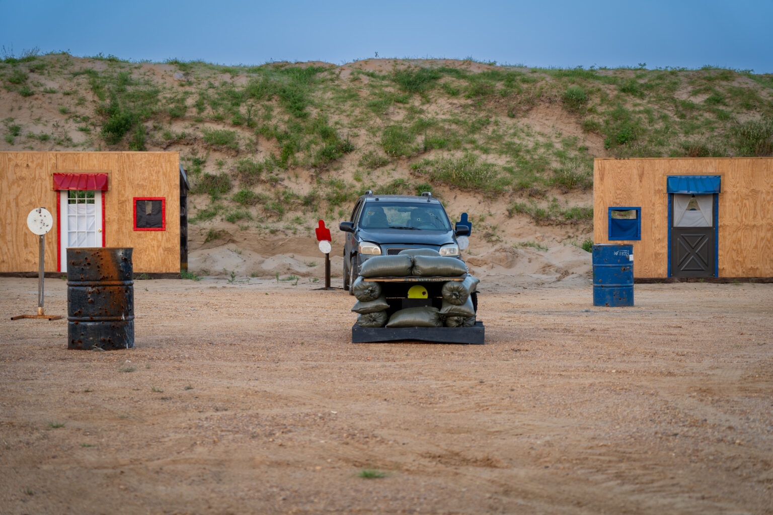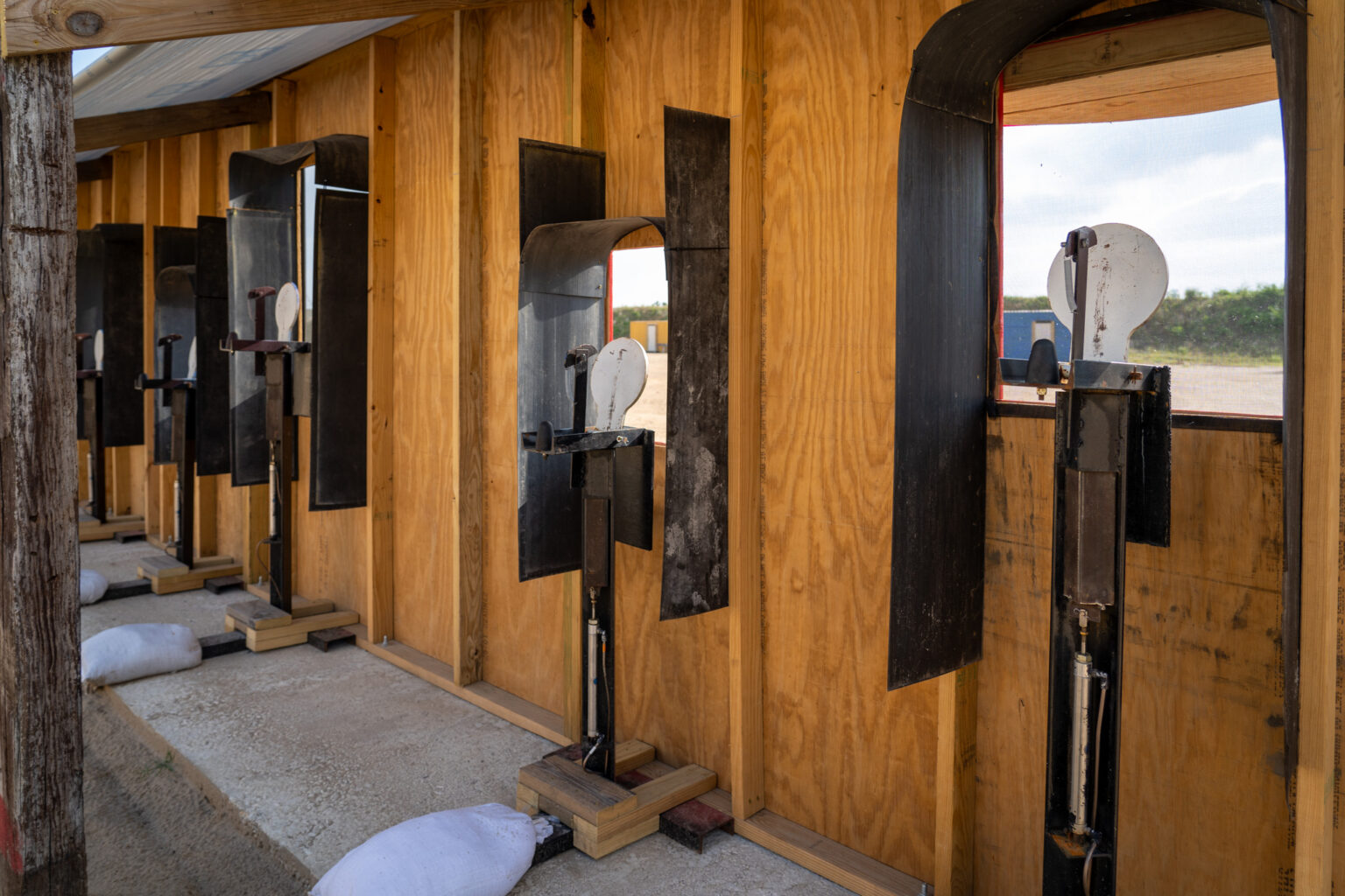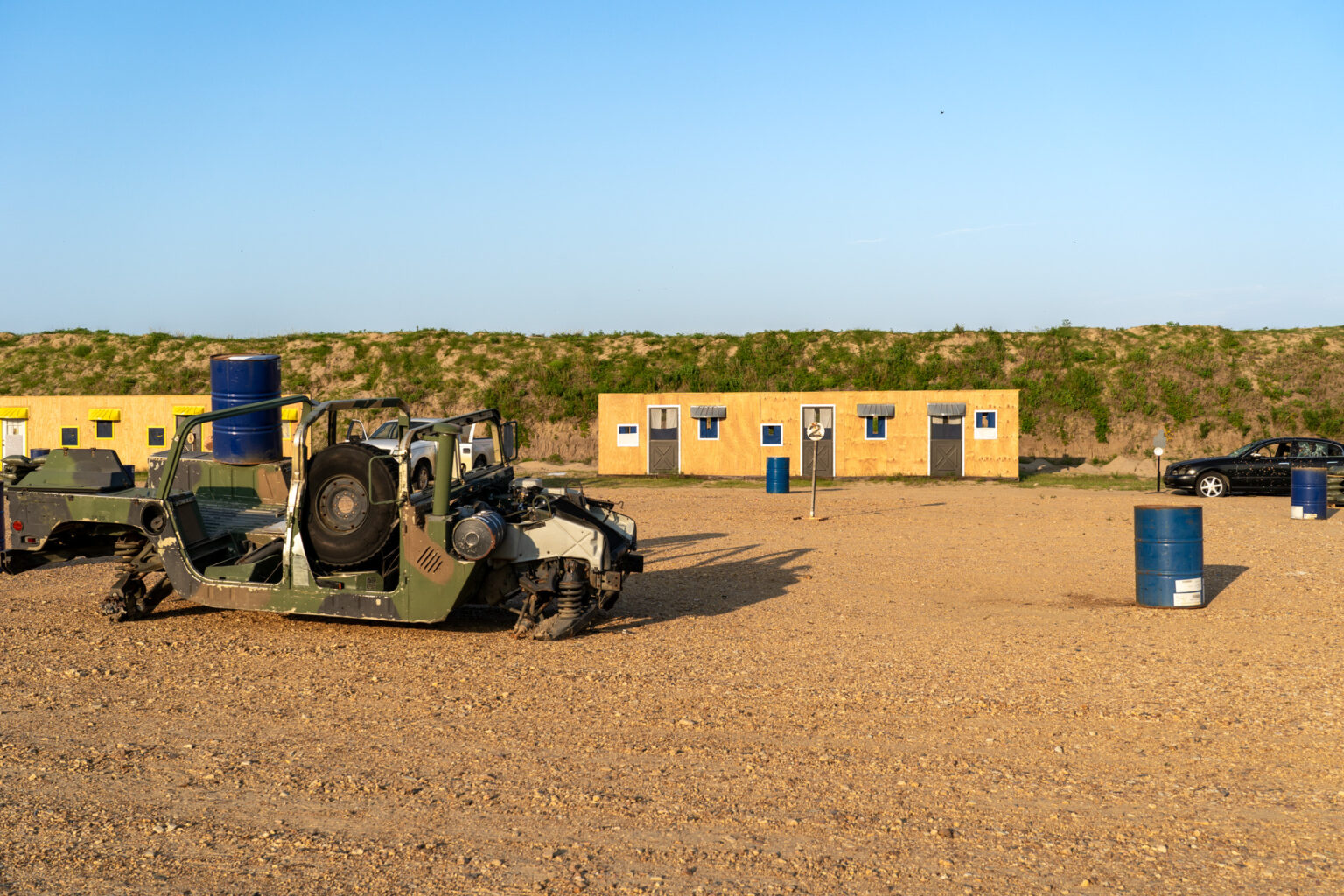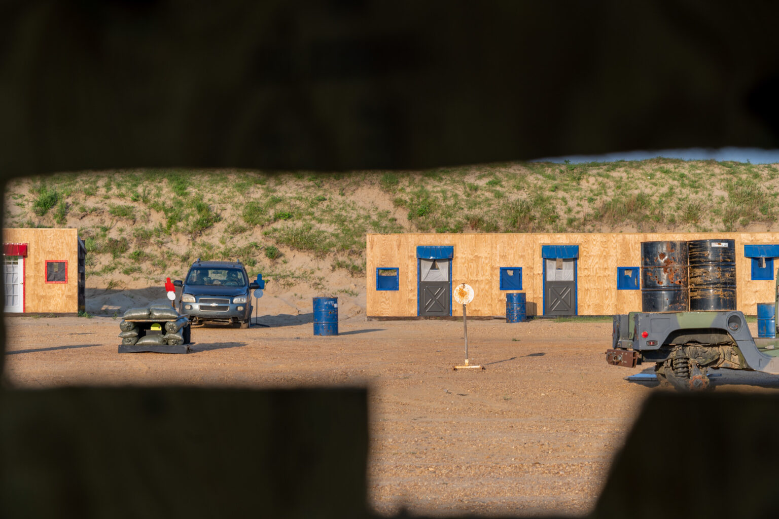 Range 4 — Hogan’s Alley — is a 210,000 sq ft, 300-yard, 270° multipurpose range that safely hosts up to 100 shooters simultaneously. Five lanes, each with a different target configuration and different door and window shooting positions. 40 pneumatic targets with eight per lane — static and steel arrays configurable to unit requirements. Every shooting station supports prone, kneeling, standing, and movement drills. Vehicle access points allow shooting from moving and static vehicles for mounted force protection and immediate action drills.