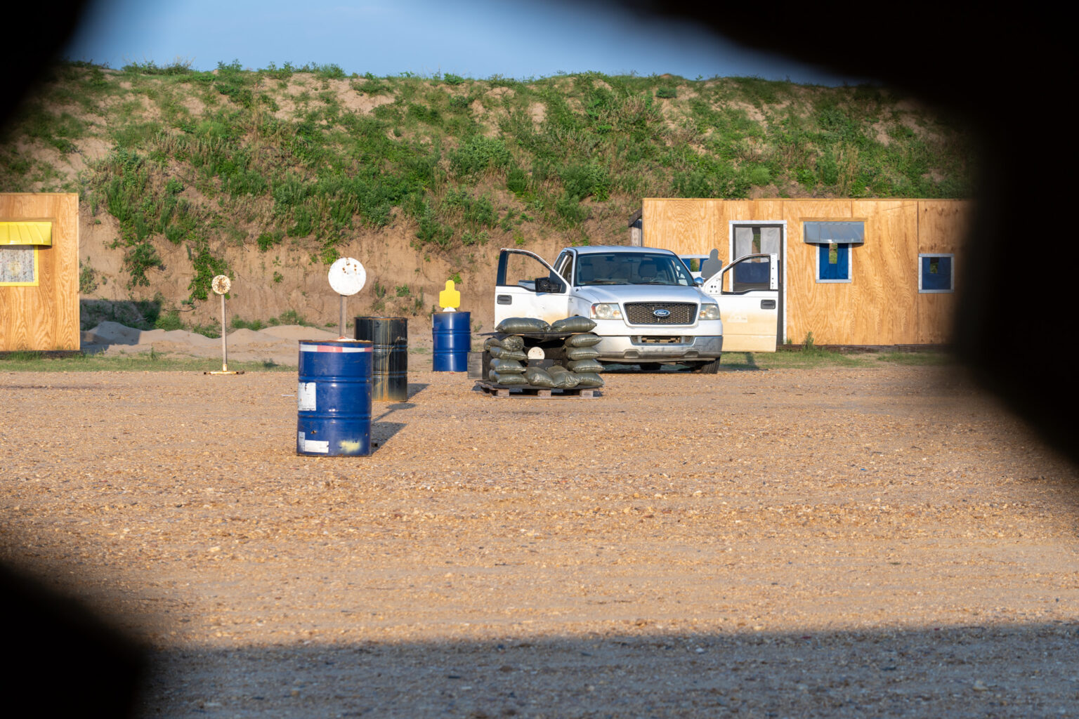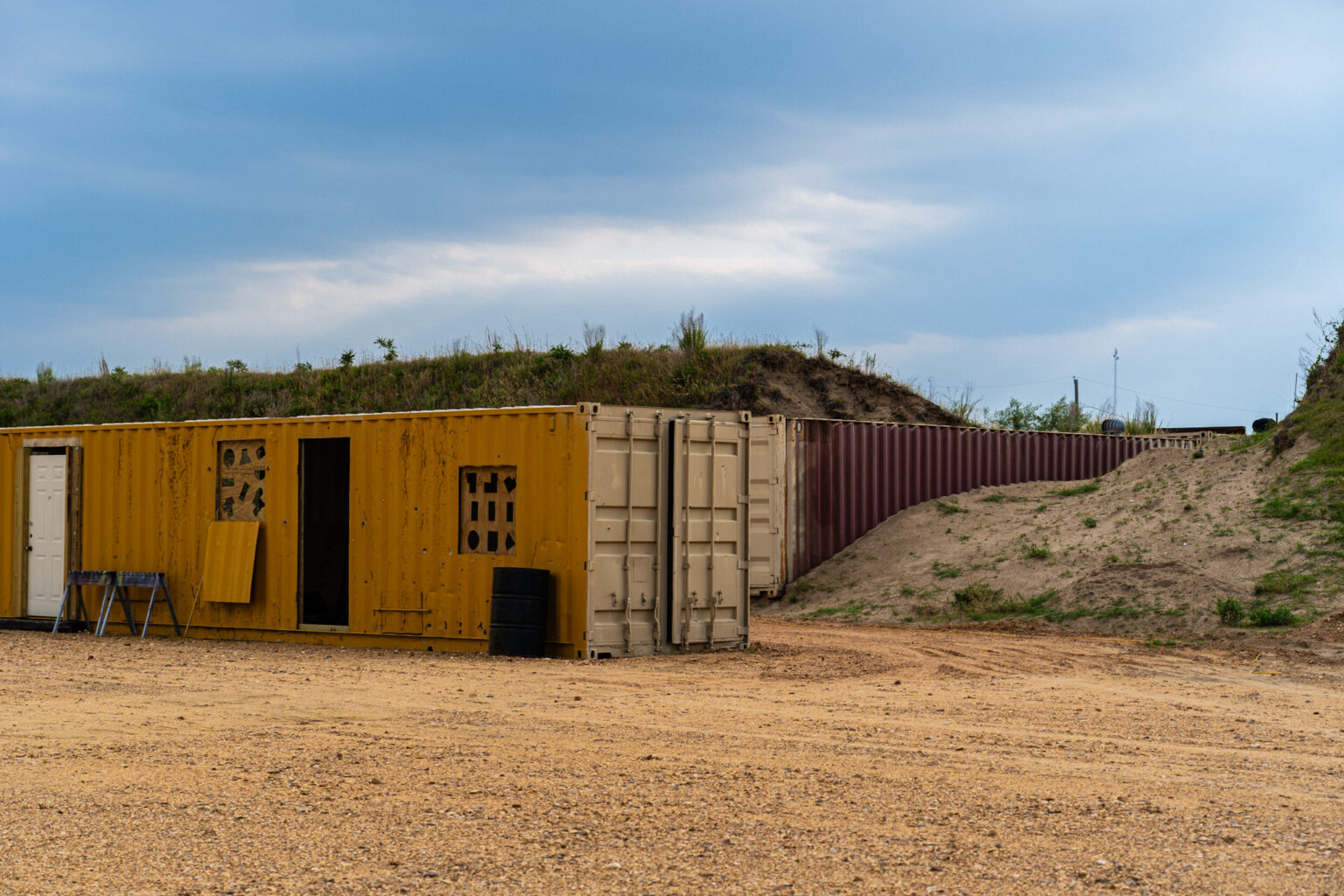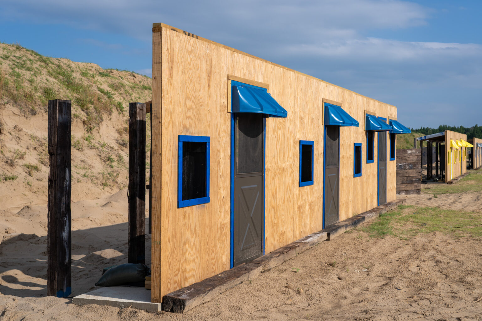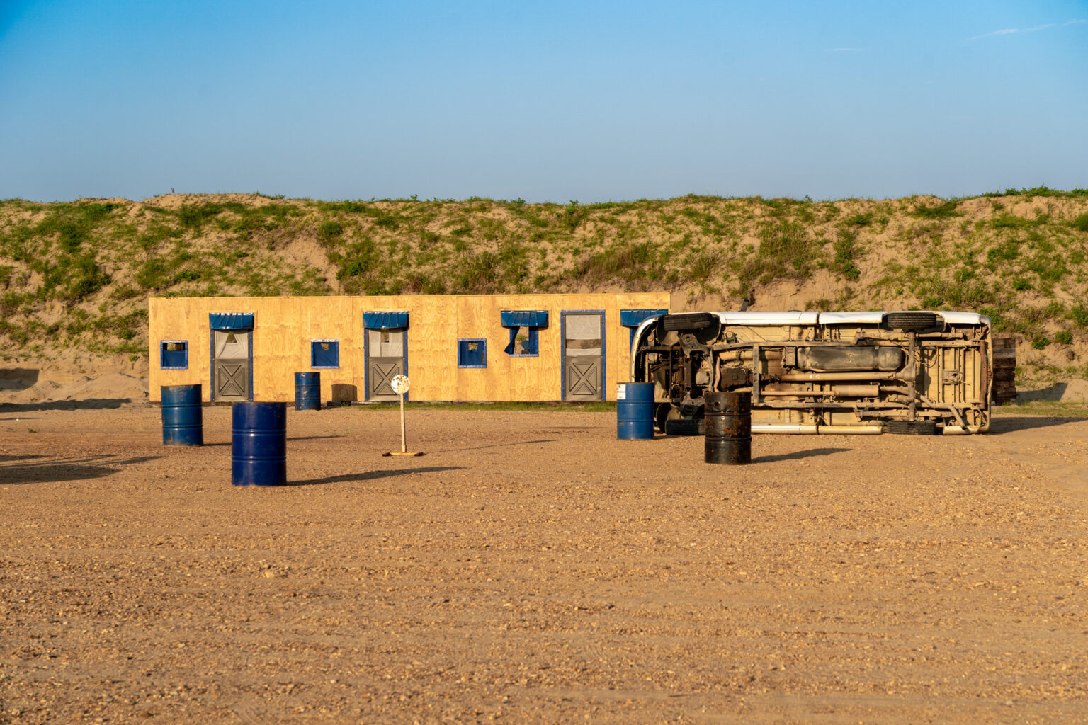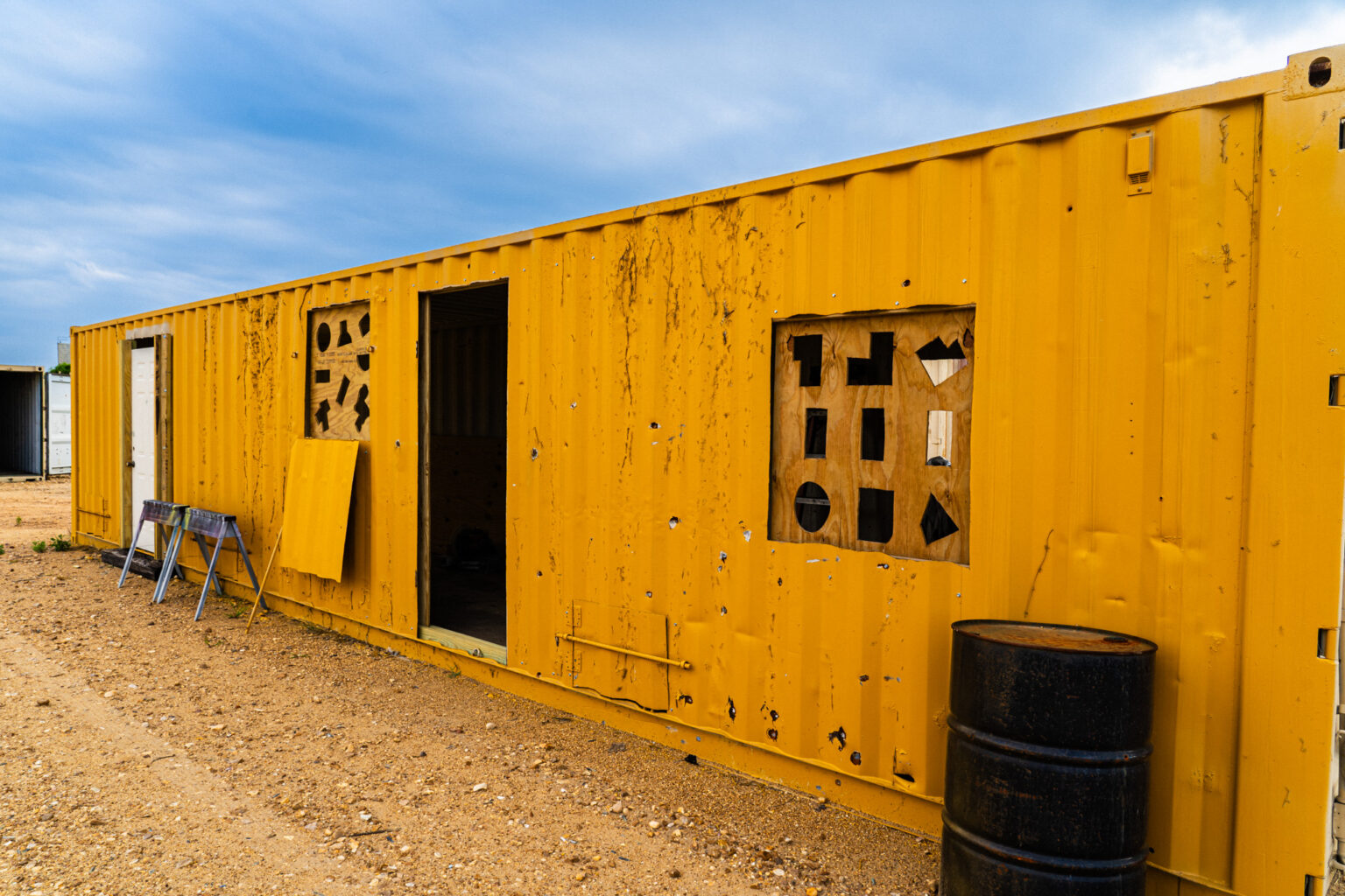 Range 4 — Hogan’s Alley — is a 210,000 sq ft, 300-yard, 270° multipurpose range that safely hosts up to 100 shooters simultaneously. Five lanes, each with a different target configuration and different door and window shooting positions. 40 pneumatic targets with eight per lane — static and steel arrays configurable to unit requirements. Every shooting station supports prone, kneeling, standing, and movement drills. Vehicle access points allow shooting from moving and static vehicles for mounted force protection and immediate action drills.
